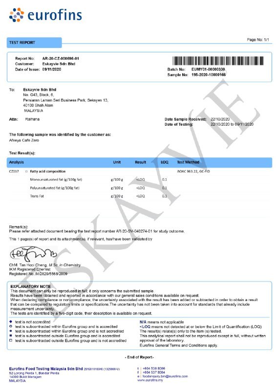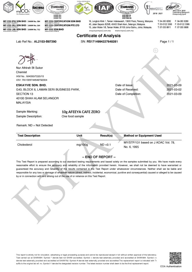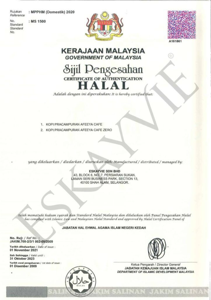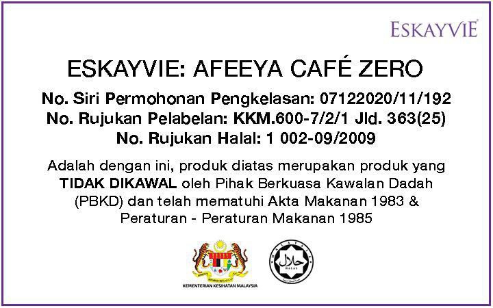 Cafe Afeeya Zero LULUS KKM, DISAHKAN HALAL JAKIM & LULUS UJIAN MAKMAL