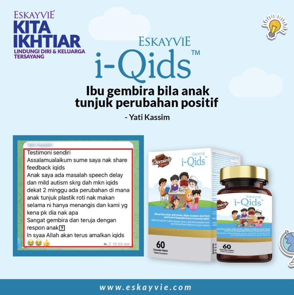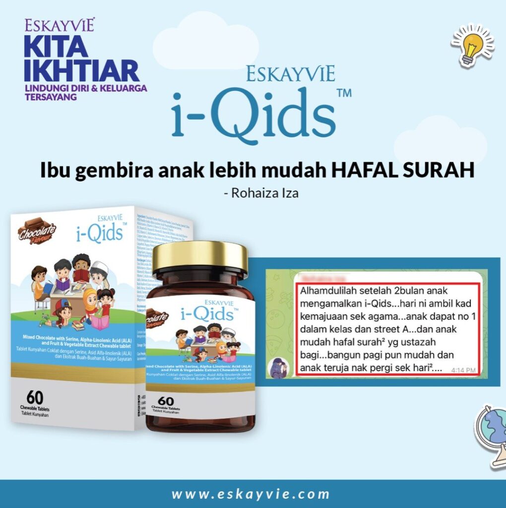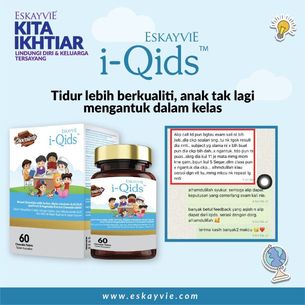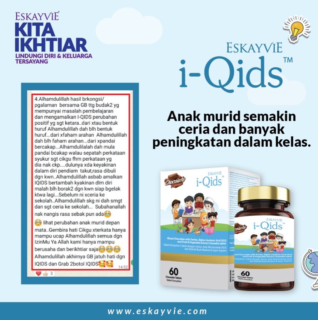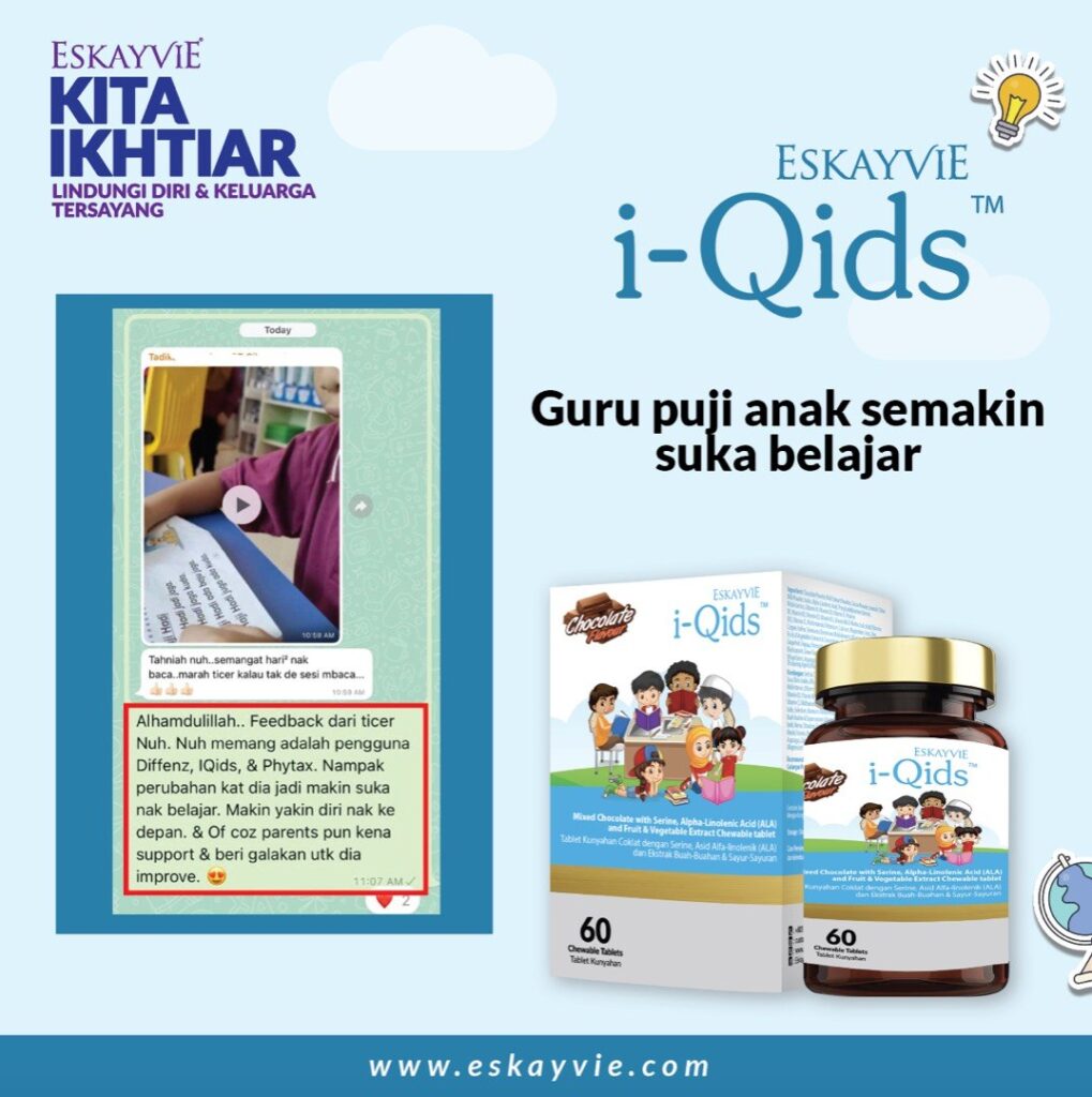 PENAFIAN: Eskayvie i-Qids merupakan suplemen bagi menyokong penjagaan gaya hidup sihat individu. Ia mungkin menunjukkan kesan dan tempoh yang berbeza mengikut keserasian individu tersebut.