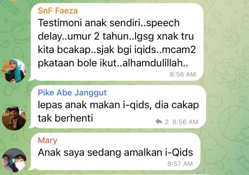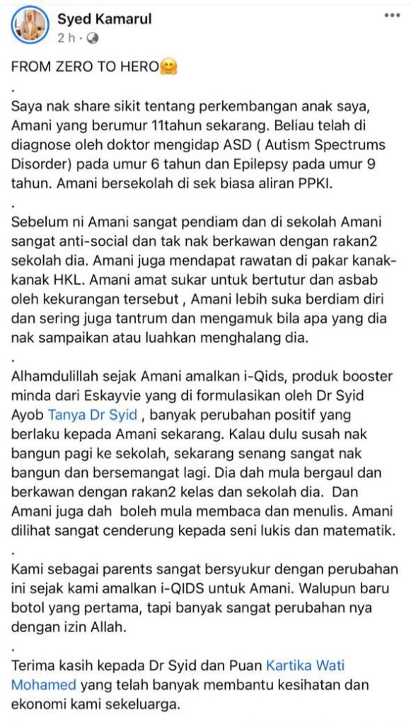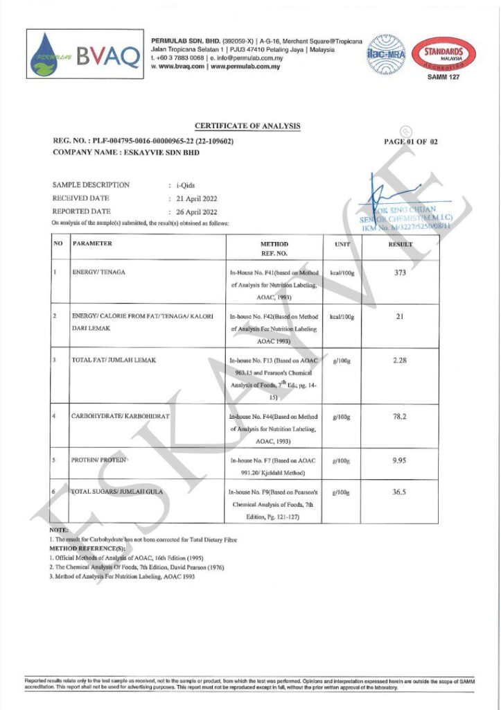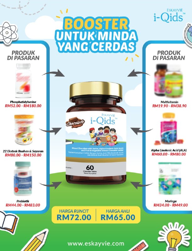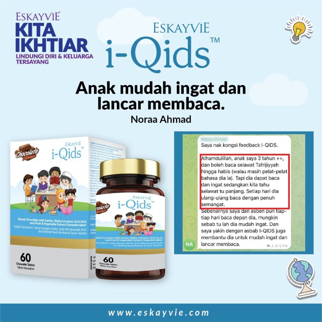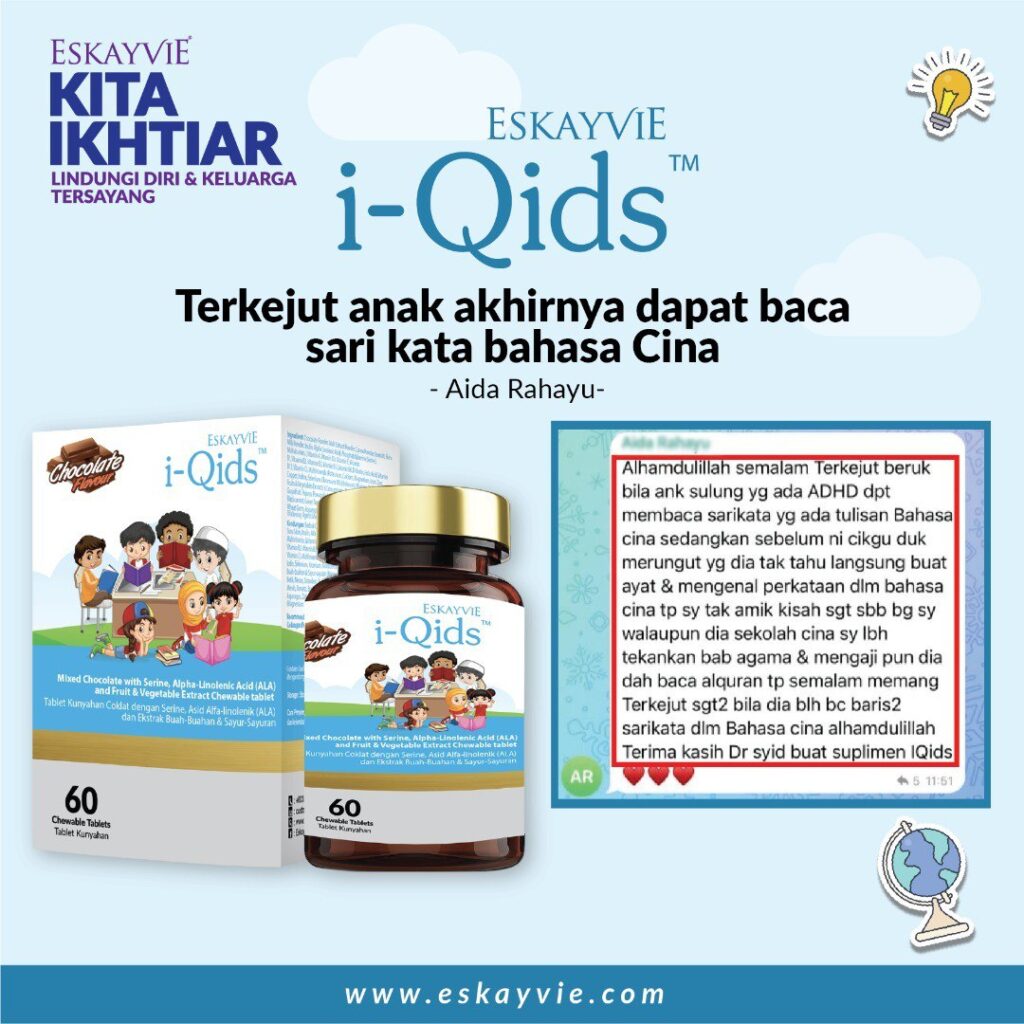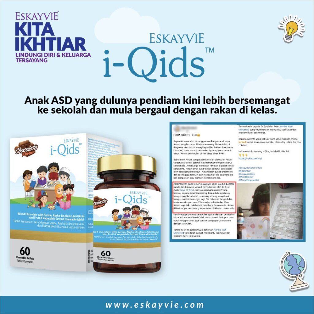 PENAFIAN: Eskayvie i-Qids merupakan suplemen bagi menyokong penjagaan gaya hidup sihat individu. Ia mungkin menunjukkan kesan dan tempoh yang berbeza mengikut keserasian individu tersebut.