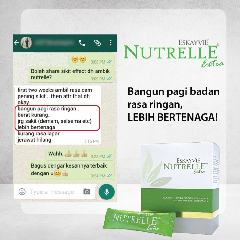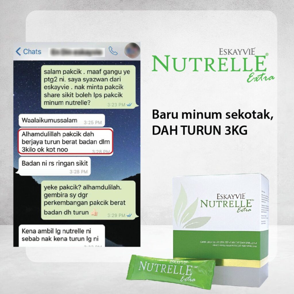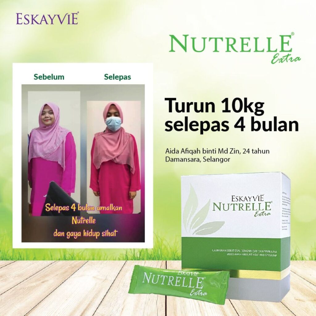 PENAFIAN: Eskayvie Nutrelle Extra merupakan suplemen bagi menyokong penjagaan gaya hidup sihat individu. Ia mungkin menunjukkan kesan dan tempoh yang berbeza mengikut keserasian individu tersebut.