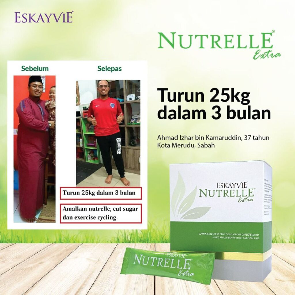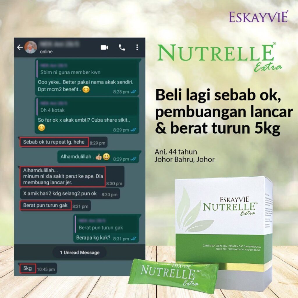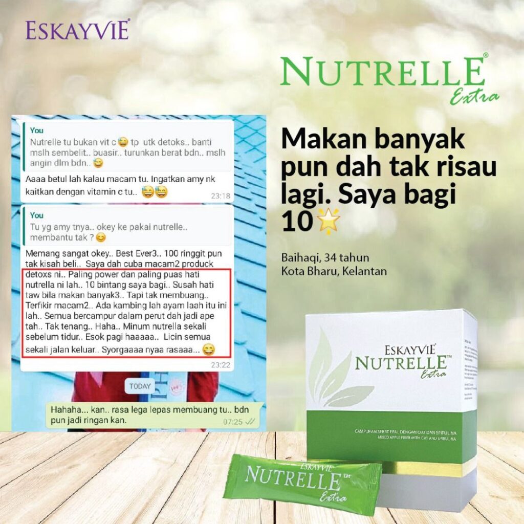 PENAFIAN: Eskayvie Nutrelle Extra merupakan suplemen bagi menyokong penjagaan gaya hidup sihat individu. Ia mungkin menunjukkan kesan dan tempoh yang berbeza mengikut keserasian individu tersebut.