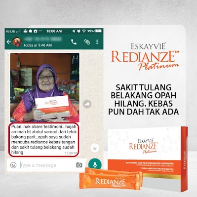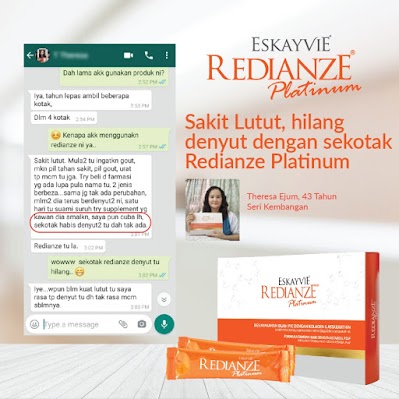 REDIANZE PLATINUM, Formulasi Khas Dengan Kandungan Nano Collagen Bersama Anti-Oksidan Berpaten Yang Diimport Dari Jepun Iaitu AstaREAL P2AF. Gabungan Bahan Ini Dapat Melegakan Sakit Dan Radang Sendi.
