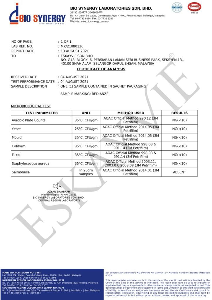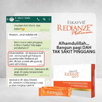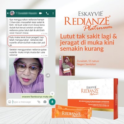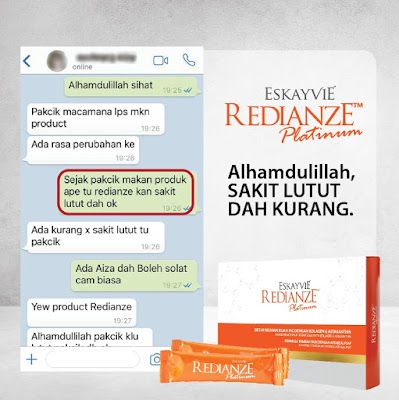 PENAFIAN: Eskayvie Redianze Platinum merupakan suplemen bagi menyokong penjagaan gaya hidup sihat individu. Ia mungkin menunjukkan kesan dan tempoh yang berbeza mengikut keserasian individu tersebut.