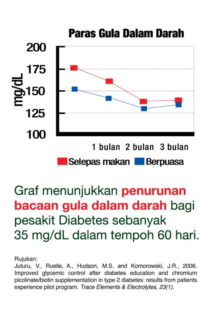 Pertama, melalui gabungan Kromium Picollinate & Vitamin B7 yang dapat menurunkan paras gula darah dengan lebih efektif.